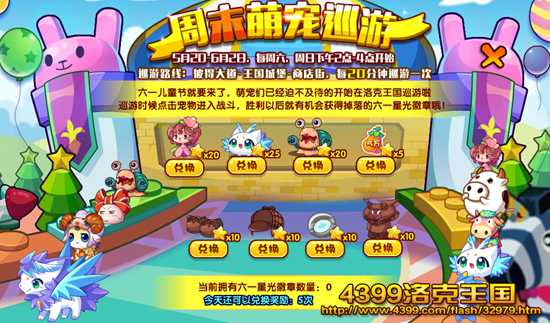六一儿童节就要来了,萌宠们已经迫不及待的开始在洛克王国巡游啦!每周六、周日下午2点-4点,点击巡游的宠物进入战斗,胜利就有机会获得六一星光徽章哦!徽章可以兑换各种奖励呢!