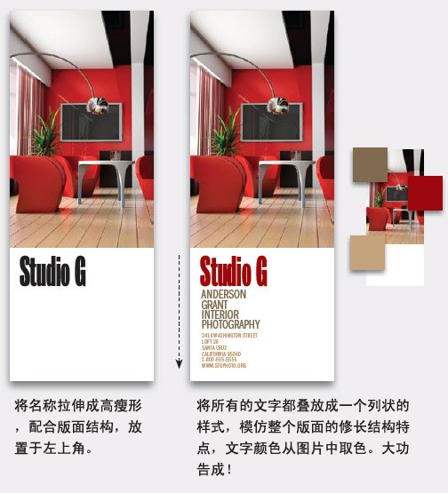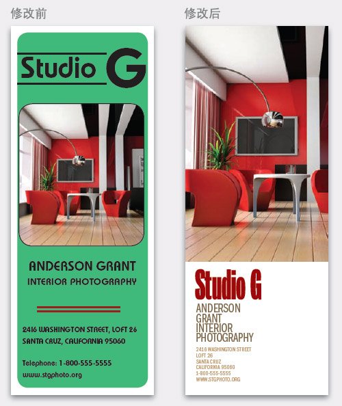 这是一家室内家居专业摄影工作室的册子封面,修改前的设计是一种"吃力"的设计。 设计师选择了毫不相关的字体及颜色,然后又加上背景及线条,希望使其成为一个有机的整体。其实,设计没必要搞得这么复杂!