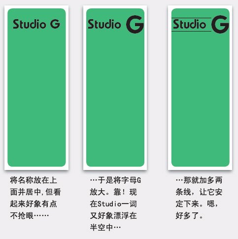 保留对齐特性:包豪斯这种字体结构决定了你很难将它们的字母紧缩排列,所以也意味着我们很难象上面一样,将文字整体设置成一个具有强烈视觉效果的列状区域。我们需要随机应变:调整成右对齐,将名称的尺寸尽量拉大,然后将字母"g"突出右边的空白区域,起到强调的作用。作用是让文字整体搭配得更密切(想象一下,如果g不突出来,名称与下方的文字会显得很松散),当然,也使版面更活。