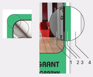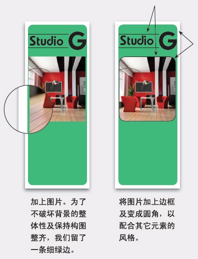 设计师深明在风格中细节必须呼应的重要性,所以他将一些地方设为圆角来呼应字体的特点(上图)。问题是,它还是不够圆,出来的效果仍然是直线占支配地位。特别是上图右所示的,我们可以观察到,这里显得非常局促,读者在观看时,看得的并不是一个整体,而是还得仔细区别你这细小的区域——竟然有4个"步骤"让读者去练眼力!毫无必要的设计。