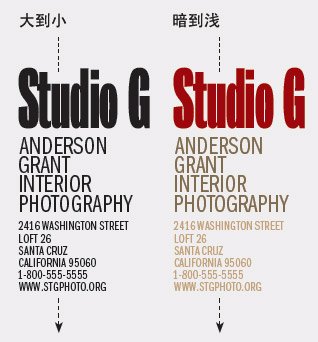 精心设计的文字包含了四个视觉引导。从位置来说,呈现由上至下的引导;从字体尺寸来说,是由大至小的引导;从字体样式来说,是由粗至细的引导;从颜色明暗来说,是由暗到亮的引导。这种特点在这个设计中发挥重要的作用,你的眼睛很自然的由一个元素去到下一个元素,毫无阻碍。